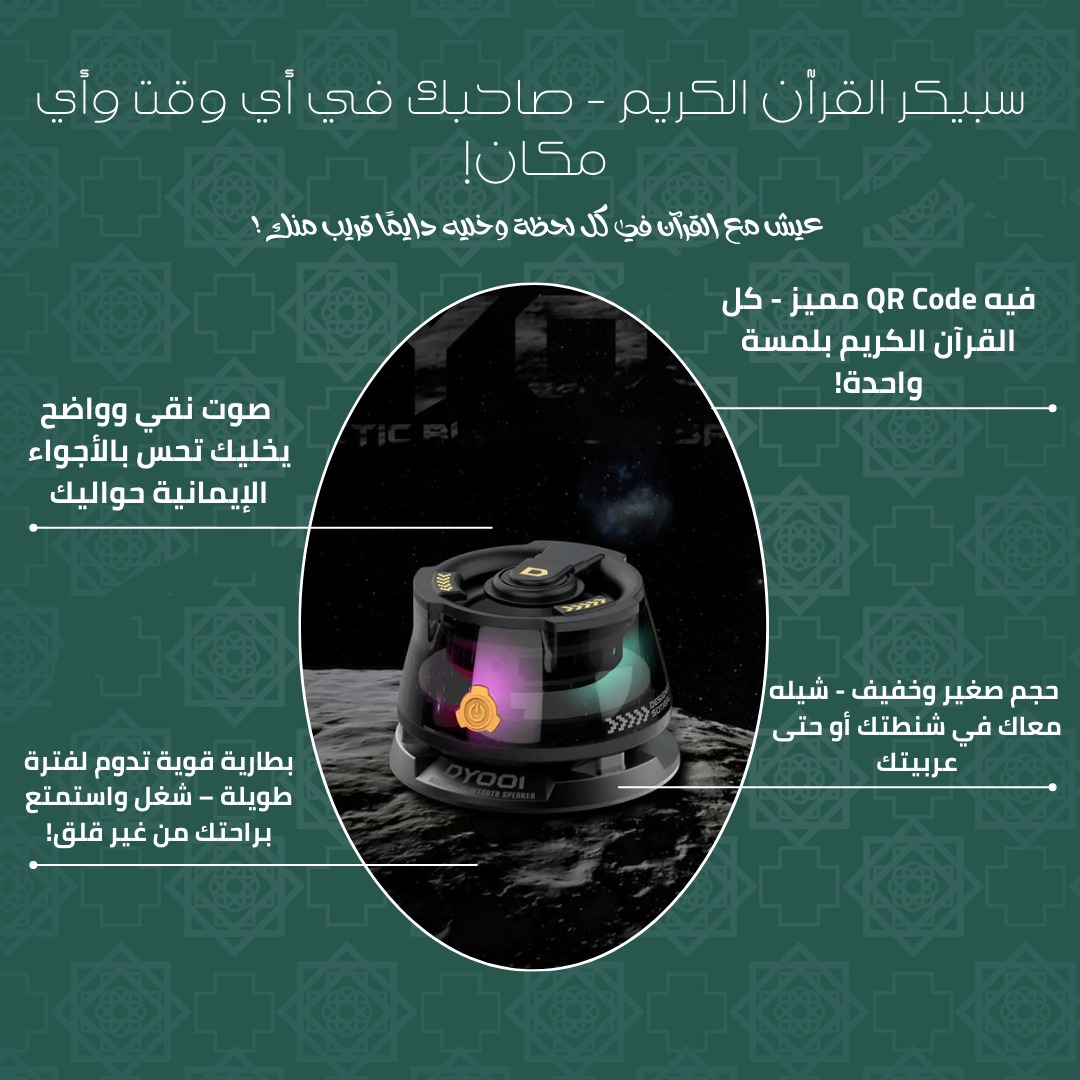 راحة البال دايما في بيتك مع سبيكر القرآن الكريم والأذكار والرقية الشرعية 🕌 ومزود ببلتوث عشان لو حابب تشغل حاجة من علي موبايلك 📲 وكمان مزود بإضاءات خفيفة بتدي نور حلو لبيتك 💫 هتخلي القرآن الكريم والأذكار شغالين طول اليوم في بيتك 🕋 كل اللي هتعمله هتحط الاسبيكر في الفيشة وهتنور بيتك بكلمات القرآن الكريم والأذكار علي مدار اليوم ☪