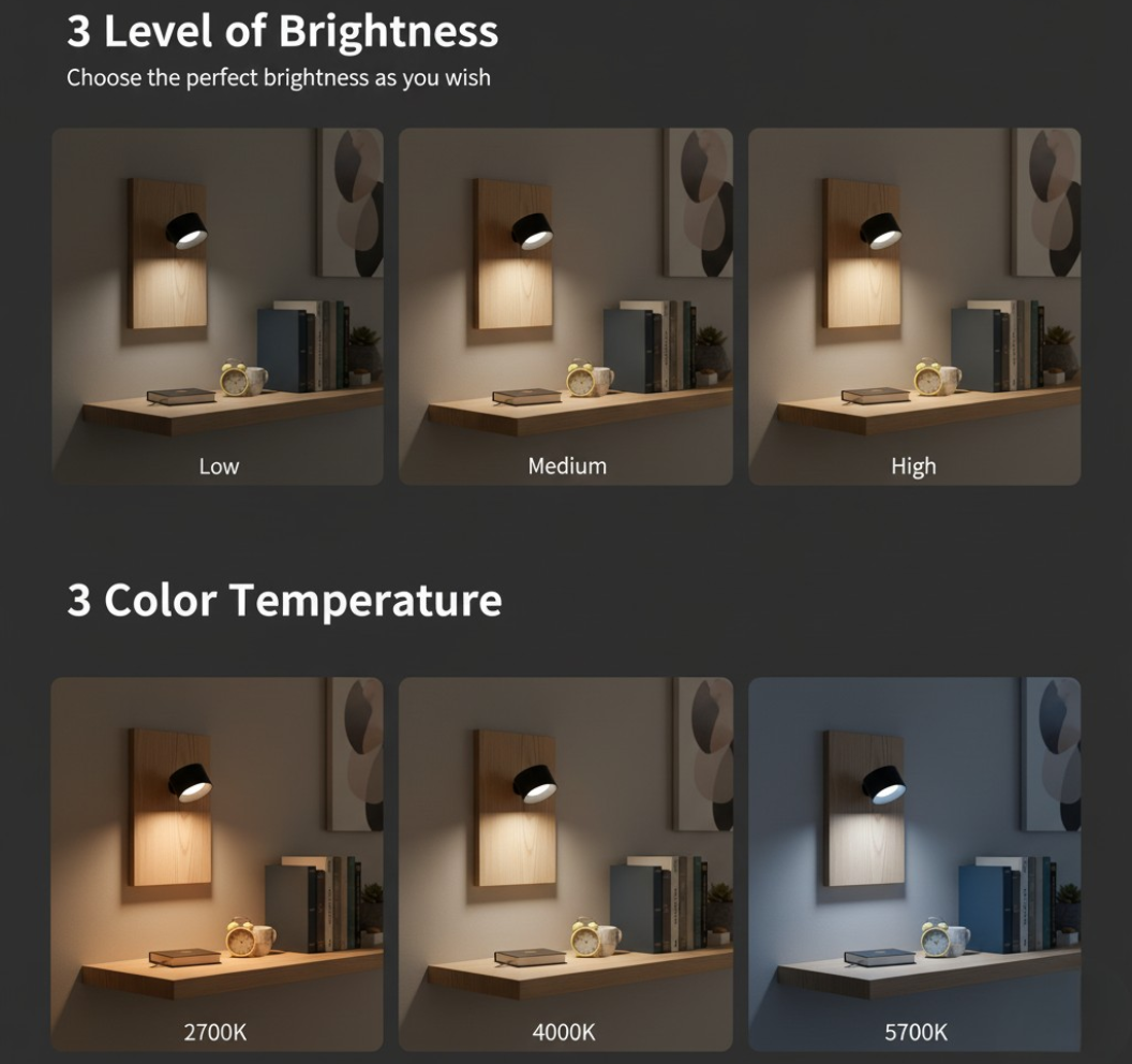 مصباح حائط انيق بدون اسلاك بتصميم عصري يناسب اي مكان في البيت بيتميز بـ3 درجات اضاءة (دافئة – طبيعية – بيضاء) مع بطارية قابلة للشحن تدوم لساعات طويلة تقدر تركبه في ثواني بفضل القاعدة المغناطيسية وتوجه الإضاءة بزاوية 360° حسب احتياجك اضاءة عملية ومريحة للعين تضيف لمسة فخمة لأي ركن في بيتك
