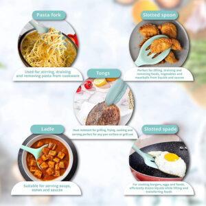 (2 ملعقة مسطحة بأحجام مختلفة – ملعقة القلي – 2 ملعقة حساء بعمق مختلف – ملعقة مصفاة – ملعقة باستا – ملعقة مسطحة الرأس – فرشاة زيت – ملعقة مشبك الطعام – خافق للبيض والكريمة)